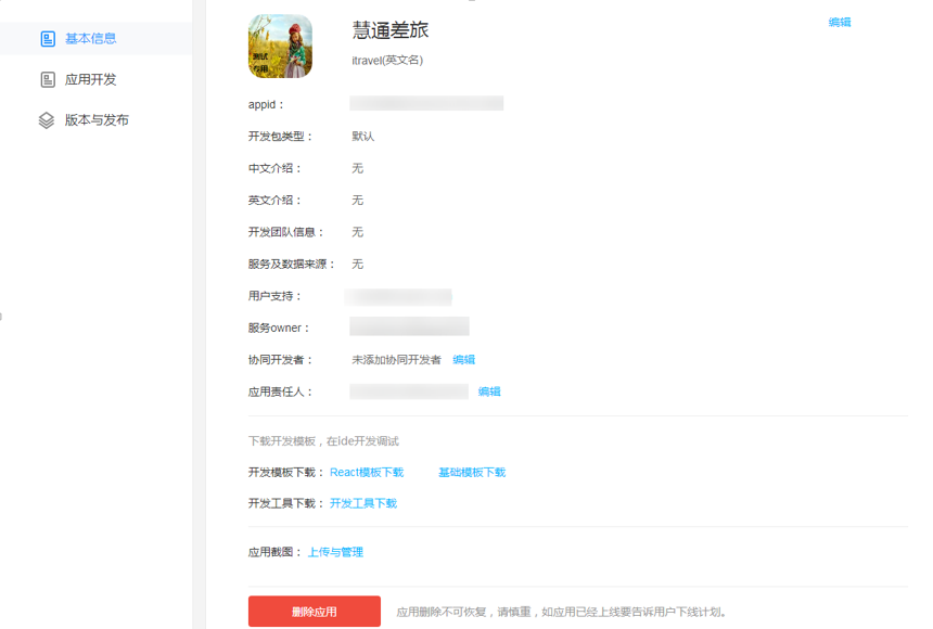 1、应用创建后会跳转到应用基本信息页,在这里可维护应用的基本信息、设置开发者和下载开发模板。